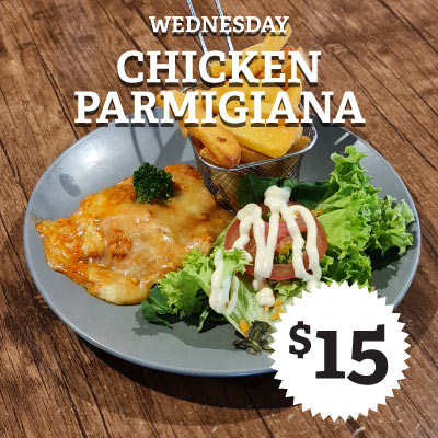 Crumbed chicken schnitzel served with salad & fries